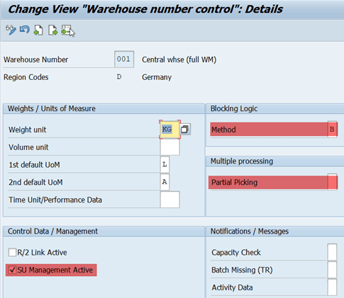 Each warehouse number has a substructure that maps the spatial arrangement in the warehouse complex in detail. Each warehouse number contains a number of subordinate organizational units (depending on the settings in Customizing): Storage types, storage sections, and picking areas