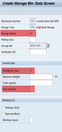 It controls the allowed storage unit types (types of load carriers like pallets) based on the bin type assigned to it, allowed fire containment sections and allowed capacity (based on the maximum weight or capacity).Using the blocking indicators, It is also possible to block a storage bin for putaway / stock removal directly from its master record.