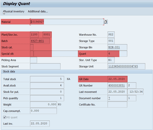 From the moment it is created, each quant has its own data record that can be displayed directly or called from the stock overviews in Warehouse Management. This data record contains information about ā quant criteria, storage information, goods receipt date and Shelf life expiration date for the quant (if required), the time of the last movement and the document number.